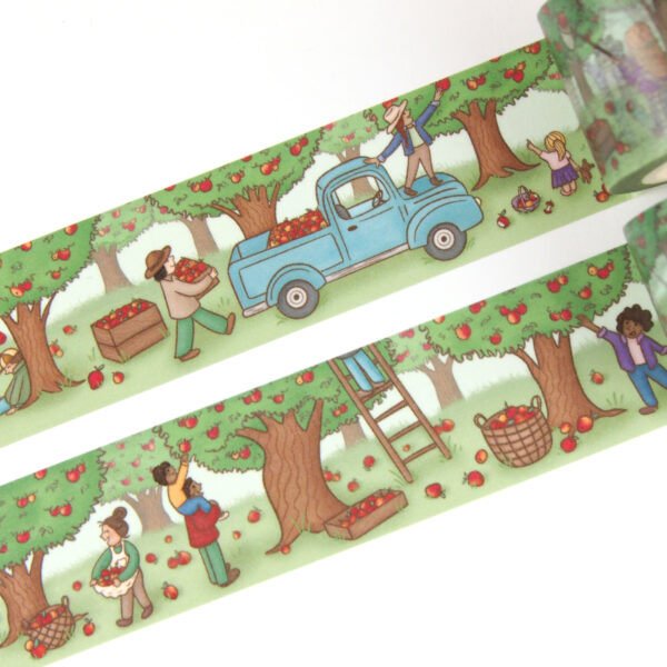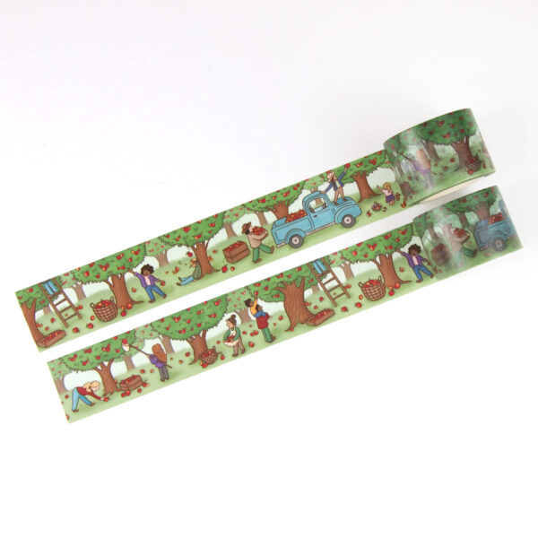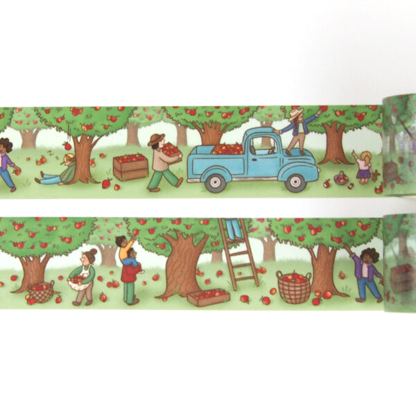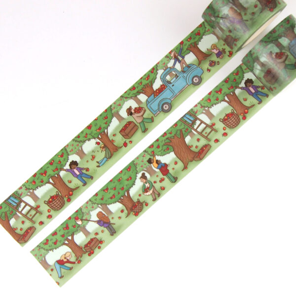 A cute washi tape of an apple orchard where people are picking delicious apples. It is a fun scene in an apple farm with families helping each other filling baskets and crates with apples and even a whole truck! This washi tape is 30mm wide and 10m long and is perfect for washi and stationery lovers!