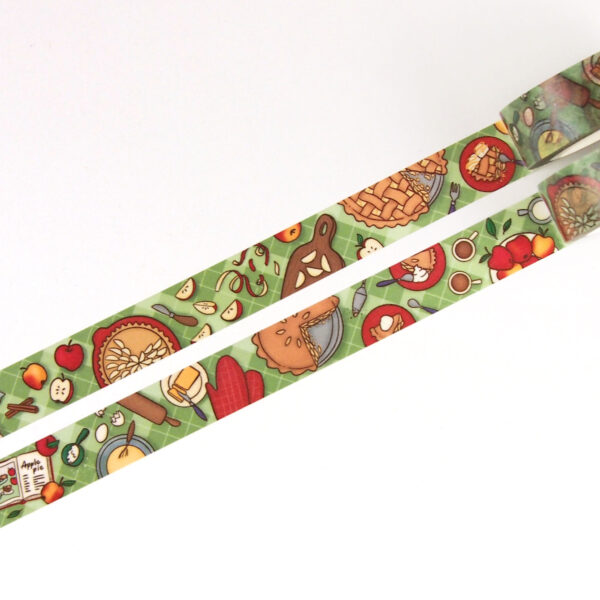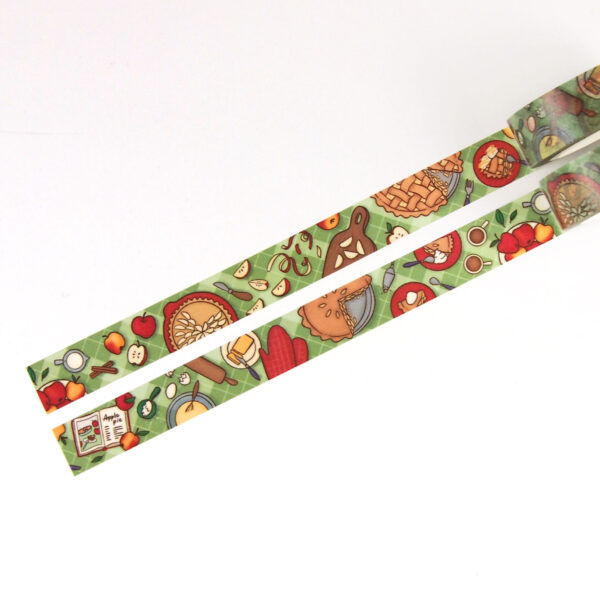 Cute washi tape with a view of a fall table of baking, serving and eating apple pies. A beautiful table filled with autumnal color illustrations of apple pies, fresh picked apples, many delicious slices of pie, a recipe book, a cutting board and everything you need to bake an apple pie. This washi tape is 15mm x 10m and will be a perfect gift for planner girls and apple pie lovers!