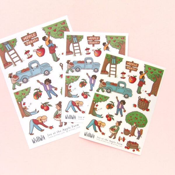 Very cute deco stickers of a visit to an Apple farm. Families picking apples and filling baskets and creates with delicious fruits. It’s perfect to decorate your planner and bullet journal with lots of cozy fall stickers!