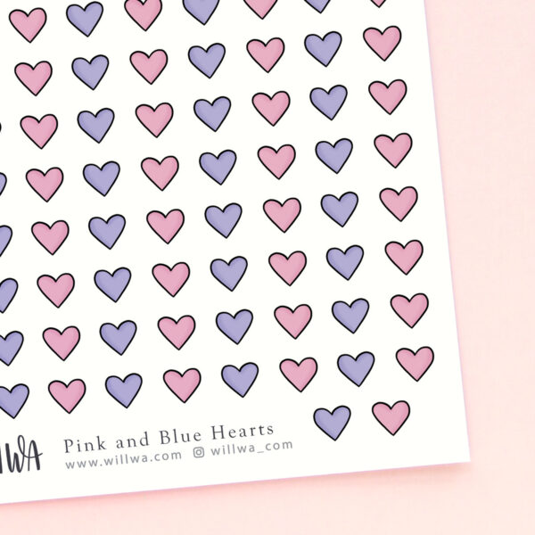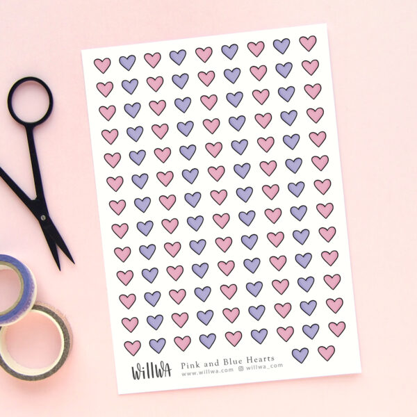A sticker sheet filled with pink and blue hearts. These mini deco stickers are perfect for planners, journals, scrapbooking and decorating your penpal letters.