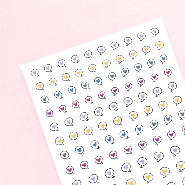 A sticker sheet filled with cute speach bubble hearts. These mini deco stickers are perfect for planners, journals, scrapbooking and decorating your penpal letters.