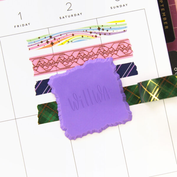 A cute washi cutter that cuts your washi to look like it has been ripped. This cutter is fun and easy to use, you just place down the washi where you want it, put the cutter on top and pull the washi tape against the cutter’s edge to rip it off. It has four different sides of ripped edges that will create the perfect ripped look every time, perfect to use in planners, bullet journals, scrapbooking or other creative projects!
